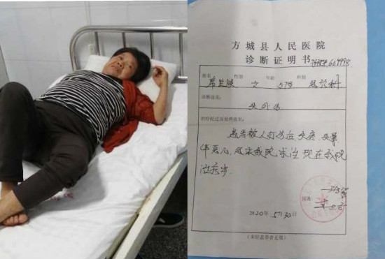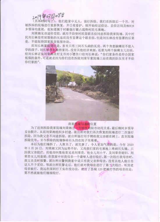 本以为他们墙拆了,人欺负了,就完事了。令人更加气愤的是,今年2020年5月26日,刘荣湘又因为运势不好,又再我们家的宅基地上堆砌石头墙,只因我父亲阻拦,而他却纠集他堂兄弟刘荣贵,他女儿刘小平,及刘荣贵媳妇,刘荣贵女儿刘喜娟,在我家中对我母亲一个聋哑人进行殴打。第一次殴打我母亲时,我父亲及时报警,派出所出警到我家中说只有我父亲和母亲,没有其他人做目击证人不予采信。等派出所民警走后,他们就对我母亲进行了第二次殴打,听到老母亲被打,我远在深圳打工实在没办法,就打了县城120把被打伤的母亲拉走,要不然就被他们继续殴打。