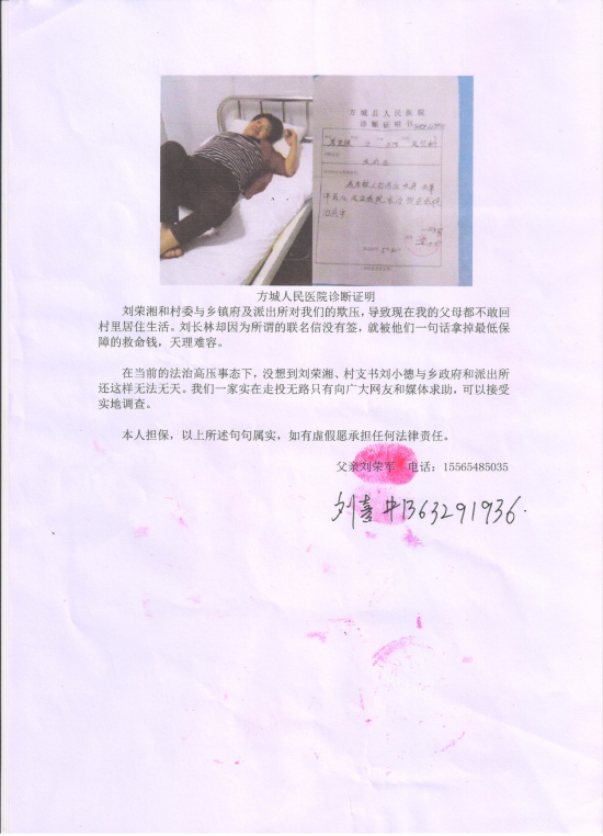 刘荣湘和村委与乡镇府及派出所对我们的欺压,导致现在我的父母都不敢回村里居住生活。刘长林却因为所谓的联名信没有签,就被他们一句话拿掉最低保障的救命钱,天理难容。