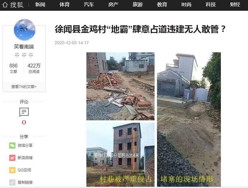 广东徐闻县金鸡村:“地霸”陈赳肆意侵占村巷违规建楼,无人敢管?