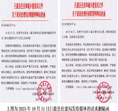 近日,河北省巨鹿县农民工讨薪事件持续发酵,多家媒体曝光邢台盛世公司及下属巨鹿盛世公司拖欠千万工资、监管部门履职缺位等问题。然而,面对舆论监督与农民工的迫切诉求,巨鹿县住房和城乡建设局(以下简称“巨鹿住建局”)非但未主动担责解决问题,反而连续向媒体发送请求删稿函,以“内容不实”“作者裹挟政府”为由要求下架报道。这份充满谎言的函件,不仅未能平息争议,更引发公众对该部门履职能力、公信力的强烈质疑。